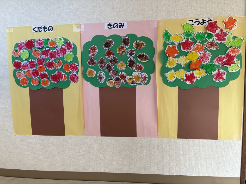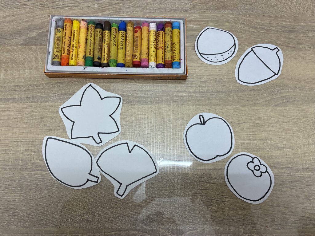 くだものはりんごと柿、木に実はどんぐりと栗、紅葉は紅葉とイチョウの葉と葉っぱなど、自分で選択した木のパーツを塗り、木に貼ると嬉しそうに見ている子どもたち。最後までぬりえに一生懸命取り組んでいました。